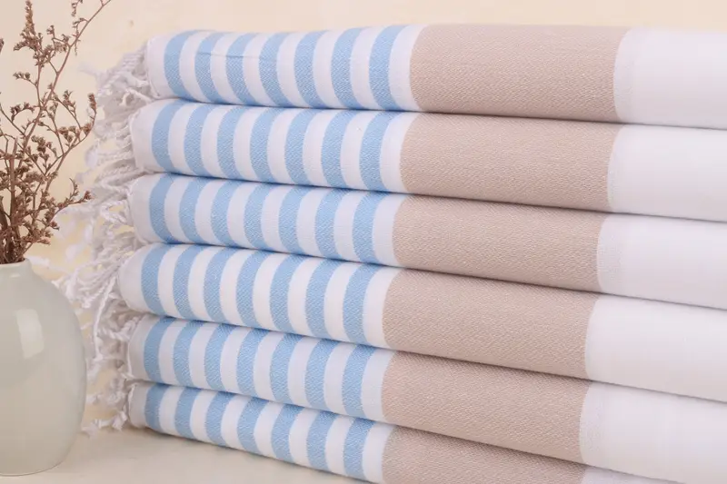 Özel Türk Havlusu Bej-Açık Mavi Çizgili, Organik Pamuk, 40x71 İnç
