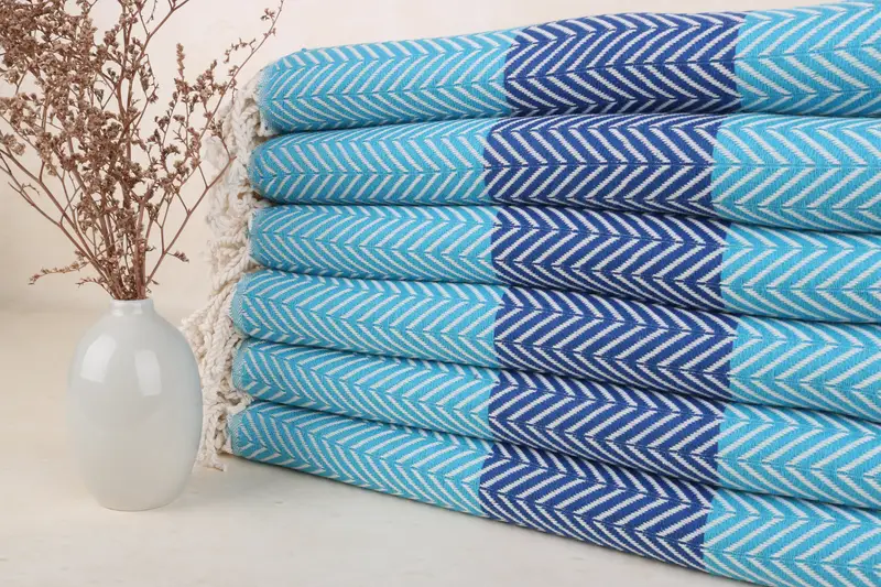 Kişiye Özel Turkuaz-Saks Mavi Chevron Havlu, Organik Pamuk, 40x71 İnç