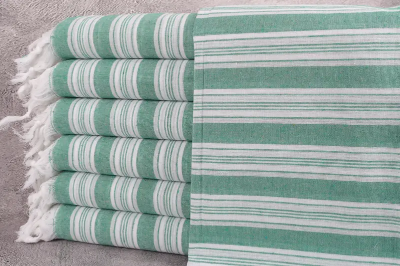 Türk havlusu, optimum emicilik ve dayanıklılık sağlayan çevre dostu birinci sınıf Türk pamuğu bileşimi ile karakterize edilir. Organik malzeme nefes alabilirliği ve yumuşaklığı garanti ederek çeşitli kullanımlar için idealdir. Dokuma işlemindeki toleranslar 2 inç veya 5 santimetreye kadar boyut farklılıklarına neden olabilir.