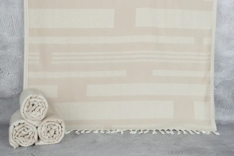 Türk Plaj Havlusu Kişiye Monogramlı Açık Bej Chevron, 38x67 İnç
