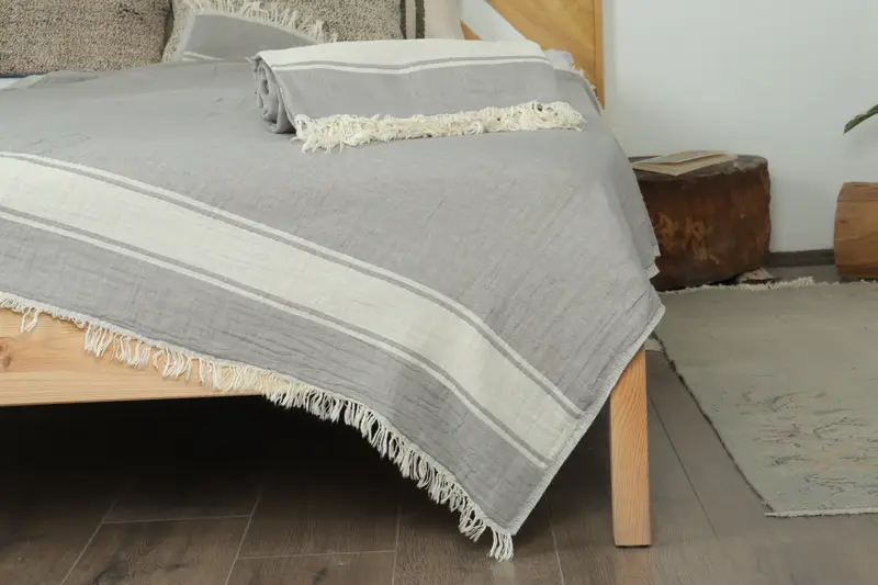 Türk Battaniyesi Koyu Gri Çizgili, 60x71 İnç Pamuklu Yatak Örtüsü
