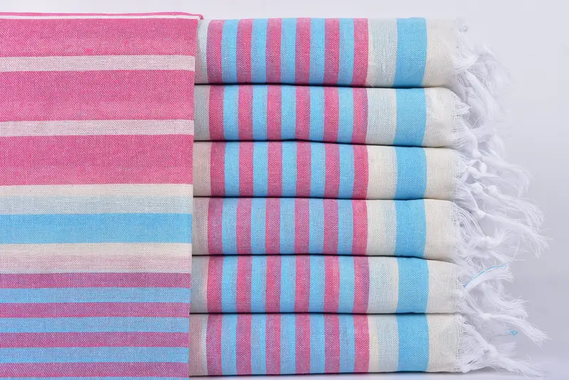 Emiciliği ve yumuşaklığıyla tanınan birinci sınıf Türk pamuğu, etkili su emilimi ve hızlı kuruma sağlar. Geleneksel tezgahlarda titizlikle el dokuması ile karakterize edilen Türk havluları, 40x67 inç veya 100x168 cm ölçülerinde, 1-2,5 cm toleranslıdır. Her bir havlunun ağırlığı yaklaşık 182 gramdır ve ön çekme, nihai ürünün 5 cm'ye kadar biraz daha küçük veya daha büyük olmasını sağlar.
