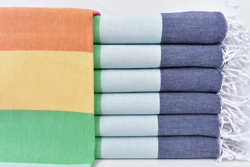 Türk Peştemal Havluları, birinci sınıf Türk pamuğundan elde dokunmuş yapıları ile karakterize edilen, üstün nem emilimi ve hızlı kuruma sağlar. Havlular 40x71 inç veya 100x180 cm ölçülerinde olup, izin verilen boyut değişiklikleri ±1-2,5 cm'dir ve yaklaşık 280 gram ağırlığındadır. Kişiselleştirme nakış yoluyla mümkündür ve önceden küçültülmüş durum garanti edilir.