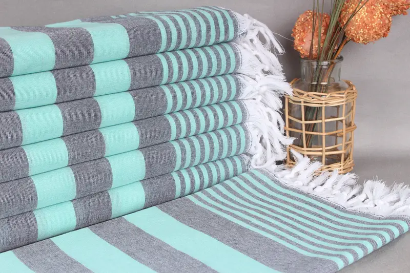 Kişiye Özel Plaj Havlusu Koyu Gri-Yeşil Çizgili, Organik Pamuk, 36x67 İnç