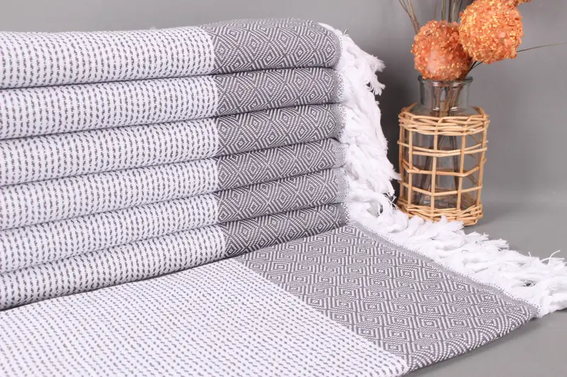 Kişiye Özel Plaj Havlusu Koyu Gri Elmas Desenli, Organik Pamuk, 40x71 İnç