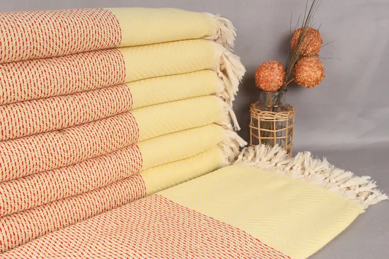 Toptan El Dokuma Kırmızı-Sarı Elmas Atkı, 79x91 İnç