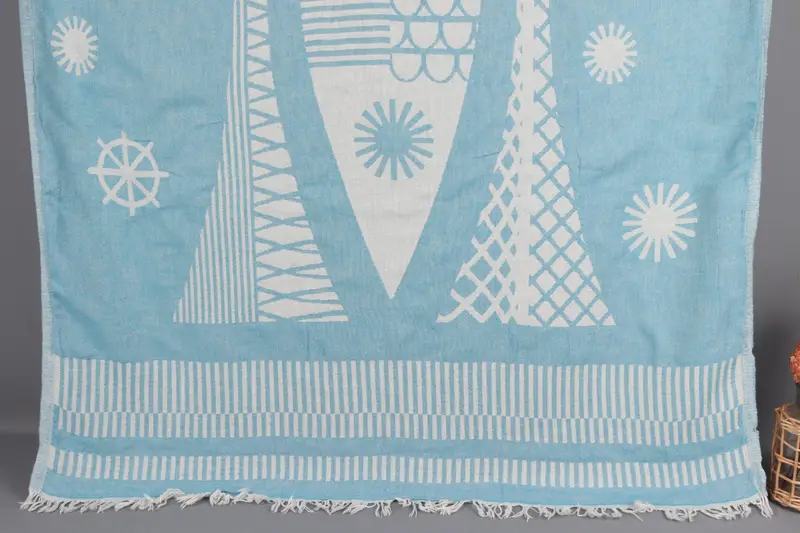 Organik pamuk ipliğinden oluşan Türk plaj havlusu üstün emicilik ve dayanıklılık sağlar. Ağırlığı 300 gram olan havlu, dokuma tekniklerinden dolayı 2 inç (5 cm) toleransla 38x69 inç (95x175 cm) boyutlarındadır.