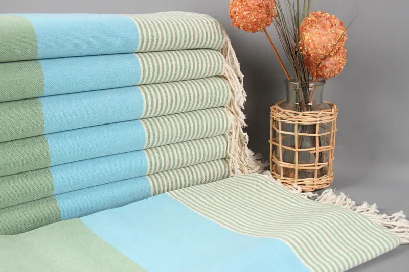 Organik pamuk ipliği, Türk plaj havlusunun malzeme bileşimini karakterize ederek yüksek emicilik ve dayanıklılık sağlar. Havlunun boyutları 40x69 inç veya 100x174 santimetre olup ağırlığı 298 gramdır. Elle dokuma işlemi, boyut değişiminde 2 inç (5 santimetre) toleransa izin verir.