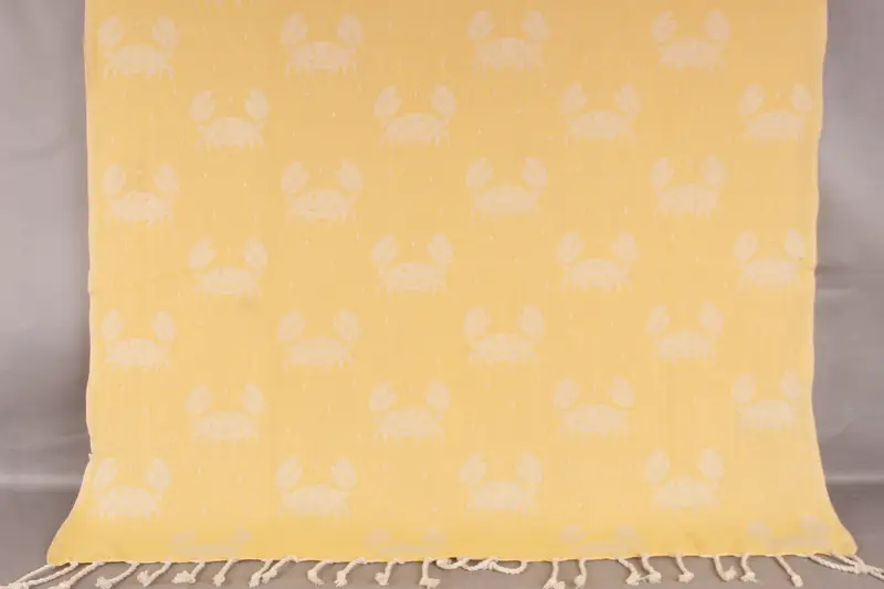 Organik pamuk ipliğinden üretilen Yengeç Tasarımlı Havlu, yüksek emicilik sağlayarak çok yönlü ve hafif bir seyahat arkadaşıdır. 40x67 inç (100x170 santimetre) ölçülerinde ve 2 inç (5cm) toleransla bu el yapımı havlunun ağırlığı 420 gramdır. Nazik yıkamayla önceden çekilen havlu, hafif ve düz dokumalı kalır. Nakış yoluyla kişiselleştirme mevcuttur ve ürün 3-5 gün içinde dünya çapında gönderilebilir. 35 USD üzeri siparişlerde ücretsiz kargo geçerlidir. Ayrıca iade ve değişim sorunsuz olarak kabul edilmektedir.