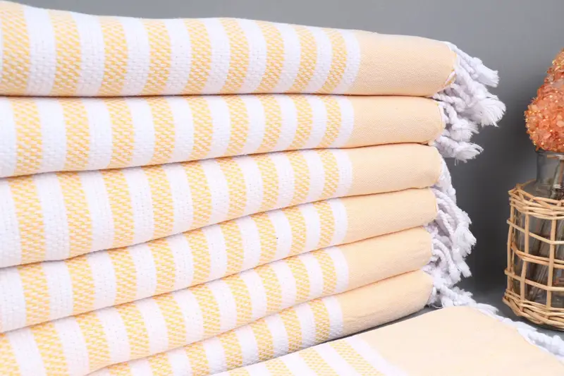 Türk plaj havlusu malzemesi, yumuşak ve emici özellikler sağlayan organik pamuk ipliği bileşimi ile karakterize edilir. Her havlu 40x67 inç (100x170 cm) ölçülerinde olup 380 gram ağırlığındadır. El dokuma toleransları 5 cm'ye (2 inç) kadar boyut farklılıklarına neden olabilir.