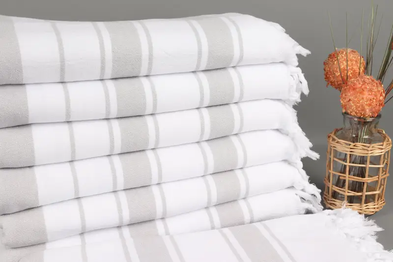 %100 organik pamuk ipliği kullanılarak el dokuması yapısıyla öne çıkan Türk havluları, yüksek düzeyde emicilik ve dayanıklılık sağlıyor. 36 x 67 inç (90 x 170 santimetre) ölçülerinde ve 450 gram ağırlığında olan bu havlular, manuel dokuma nedeniyle 2 inç (5 santimetre) boyut toleransına sahiptir. Her parça, nedime havluları veya düğün hediyeleri gibi benzersiz hediyelere olanak tanıyan nakışlarla kişiselleştirilebilir.