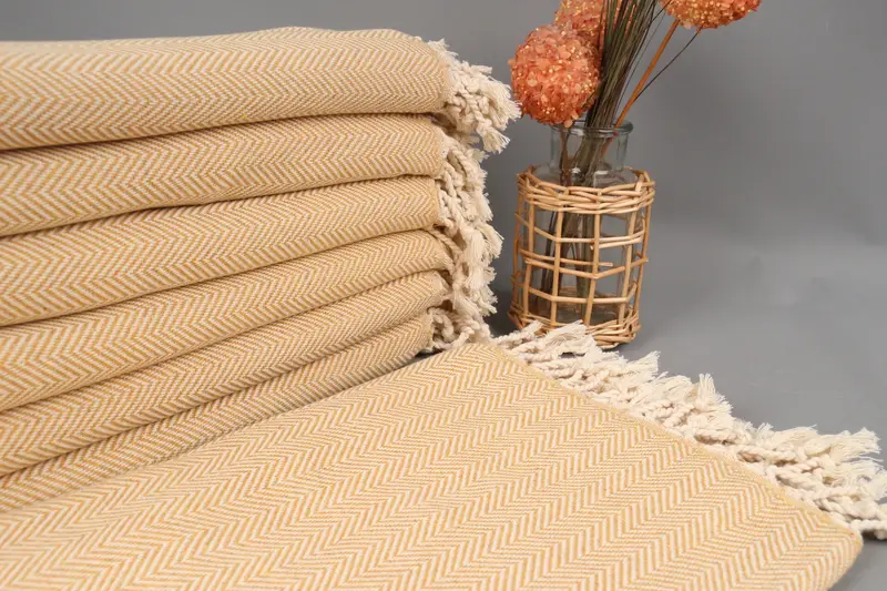 Organik pamuk ipliği, Türk havlusu için yüksek kaliteli emicilik ve dayanıklılık sağlar. Havlu 40x71 inç (100x180 santimetre) ölçülerinde, 400 gram ağırlığında ve 2 inç’e (5 santimetre) kadar elle dokuma toleransına sahip.