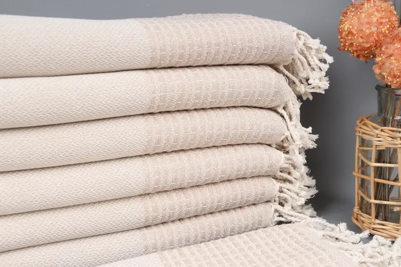 Türk havluları, yüksek emicilik ve dayanıklılık sağlayan organik pamuk ipliği kullanımıyla karakterize edilir. 420 gram ağırlığındaki bu havlular, 36x69 inç (90x175 cm) boyutlarındadır ve 2 inç'e (5 cm) kadar potansiyel dokuma toleransına sahiptir.