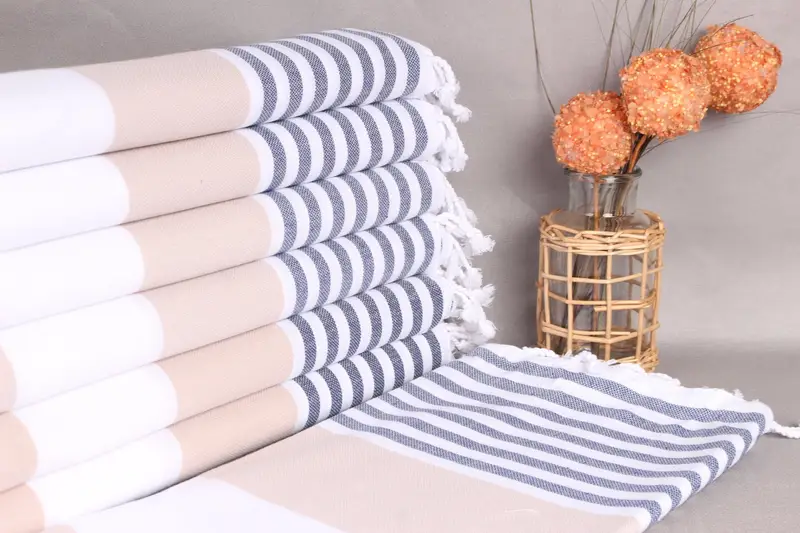 Kişiye Özel Bej-Lacivert Havlu, Çizgili Organik Pamuk, 40x71 İnç
