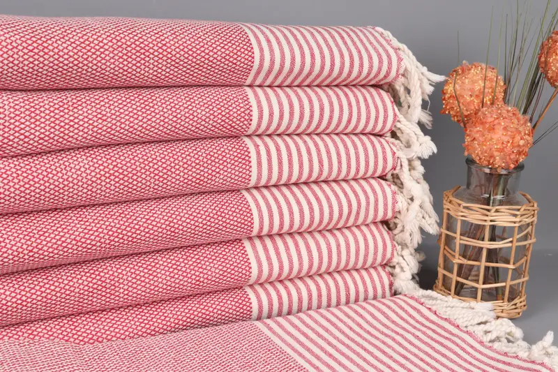 Özel Plaj Havlusu Organik Pamuk Kırmızı Çizgili, 32x67 İnç