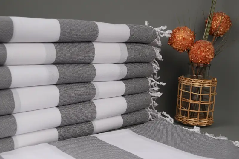 Kişiye Özel Monogram Plaj Havlusu Koyu Gri-Beyaz Çizgili, 40x71 İnç