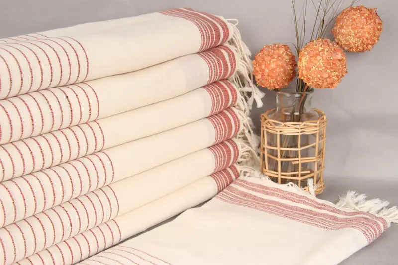 Monogramlı Plaj Havlusu Kırmızı-Kahverengi Çizgili, Organik Pamuk, 36x67 İnç