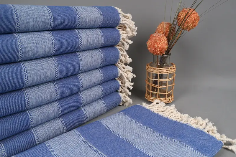 Monogramlı Plaj Havlusu Türk Pamuk Saks Mavi Çizgili, 36x65 İnç