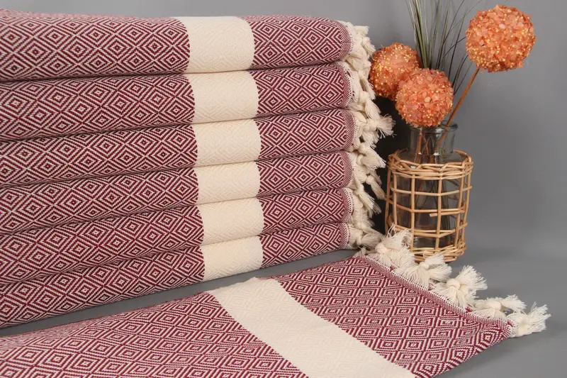 Pamuklu Çay Havlusu İşlemeli Tasarım, Bordo, Elmas, 20x36 İnç