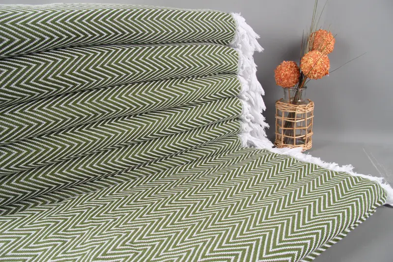 Türk Yatak Örtüsü Haki Yeşil Chevron Battaniye, Organik Pamuk, 79x95 İnç