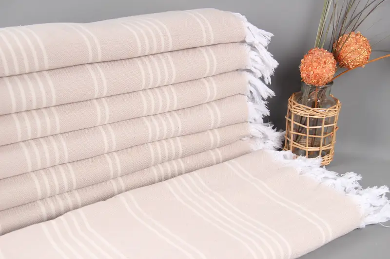 El Dokuma Bej Çizgili Battaniye, Türk Organik Pamuk, 71x95 İnç