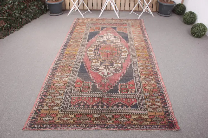 Blue Rug, 4,6x8,8 ft with Red Stripes & Geometric Shapes