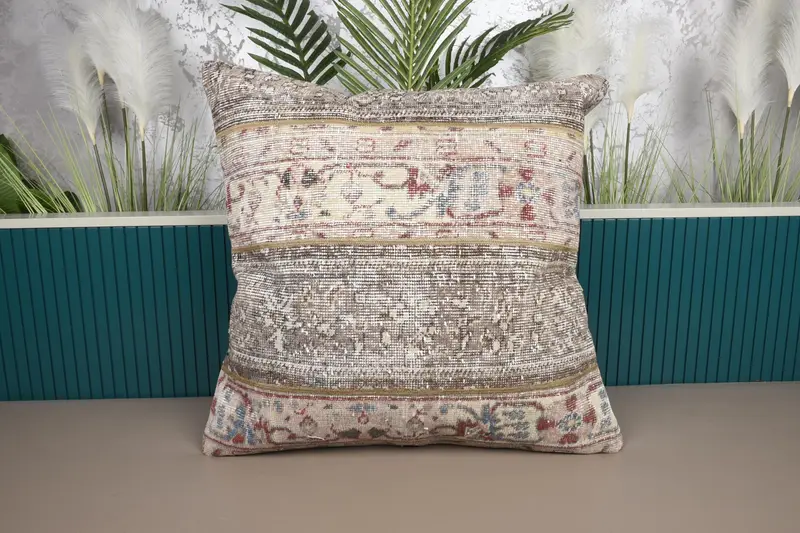 Beige & Brown Patchwork Throw Pillow, Handmade Embroidered Cushion