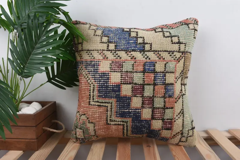 Blue & Beige Southwestern Throw Pillow, 18x18 Vintage Embroidered Cushion