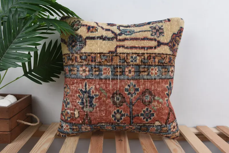 Red & Bronze Embroidered Throw Pillow, Vintage Floral Linen Pillow