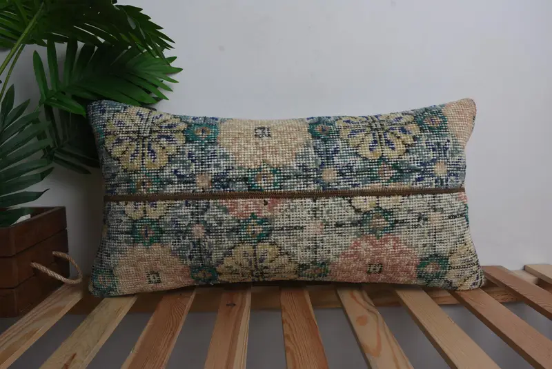 Handmade Embroidered Linen Pillow, 12x24 Green Patchwork Throw Pillow