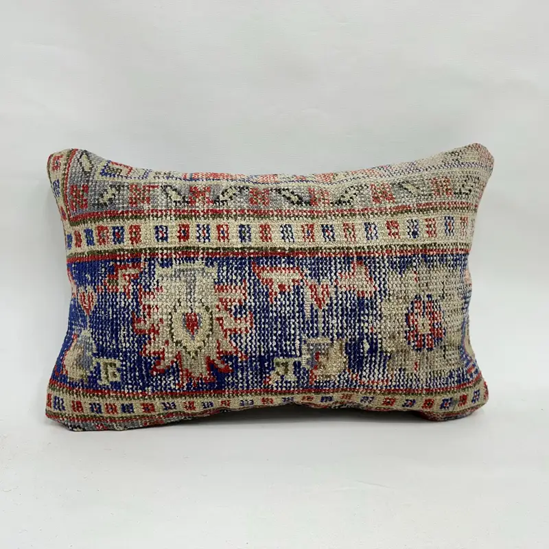 Handmade Blue & Beige Floral Throw Pillow, Vintage Rectangle Pillow