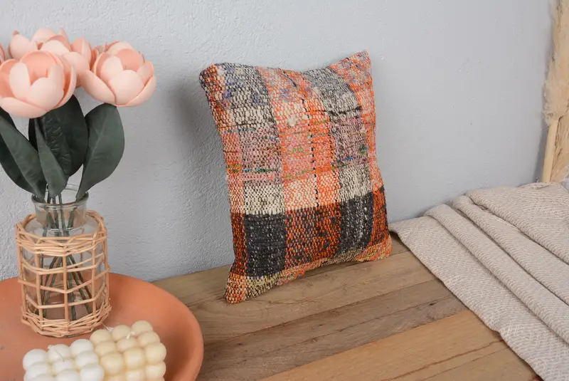 Orange & Brown Striped Throw Pillow, Vintage Embroidered Cushion