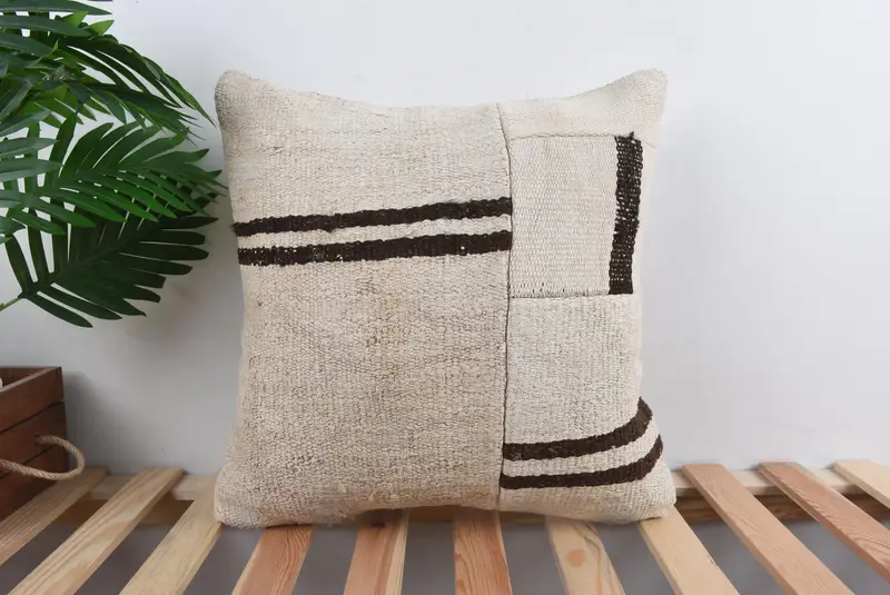 Embroidered Beige & Brown Patchwork Throw Pillow, Vintage Zippered Cushion