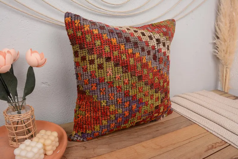 Geometric Green & Red Embroidered Throw Pillow, Vintage Cushion