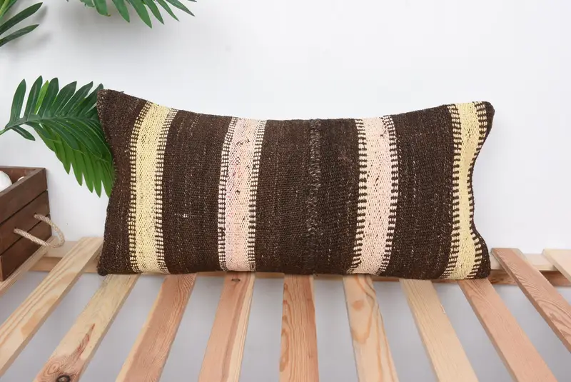 Handmade Pink & Brown Striped Pillow, 12x24 Embroidered Throw Pillow
