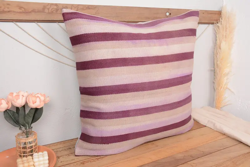 Embroidered Pink & Beige Striped Pillow, Vintage Handmade Throw Pillow