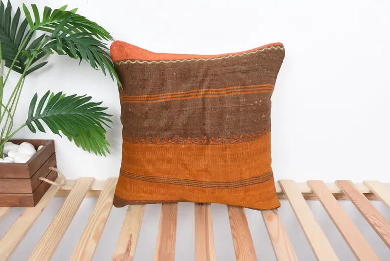 Rustic Striped Throw Pillow, Brown & Orange Embroidered Cushion