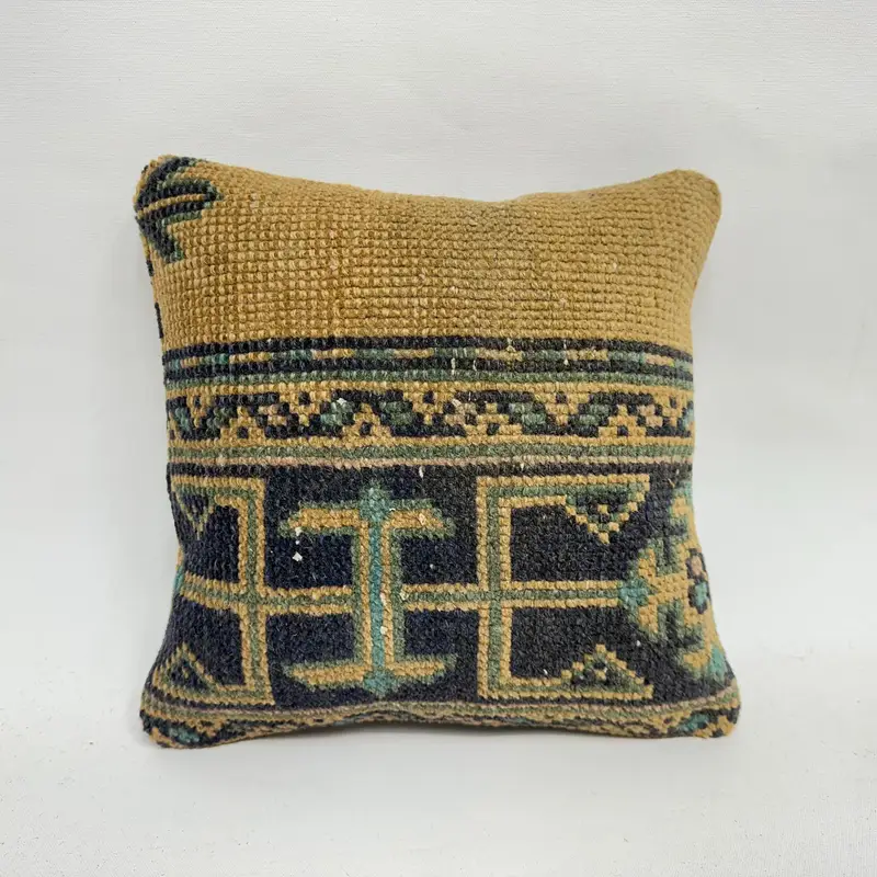 Blue & Orange Embroidered Throw Pillow, Vintage Geometric Cushion