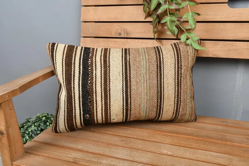Beige & Brown Striped Throw Pillow, Embroidered Rectangle Pillow