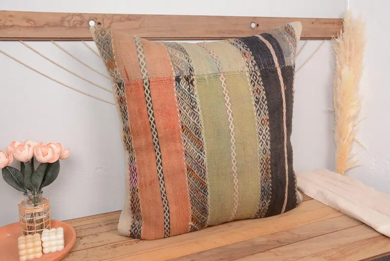 Red & Green Striped Throw Pillow, Vintage Embroidered Cushion