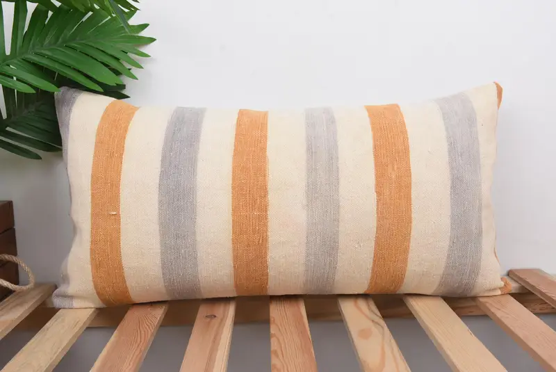 Handmade Striped Orange & Gray Pillow, 12x24 Embroidered Throw Pillow