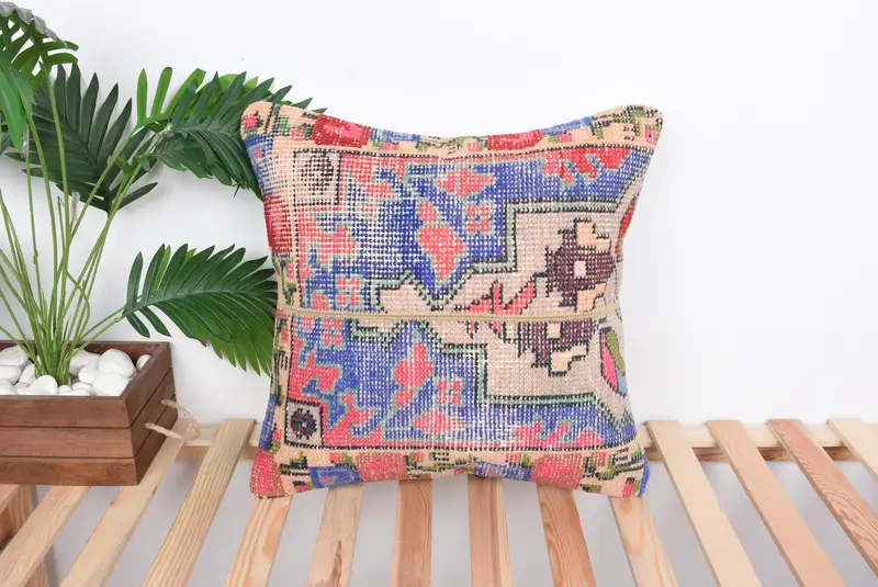 Blue & Red Patchwork Throw Pillow, 20x20 Embroidered Cushion