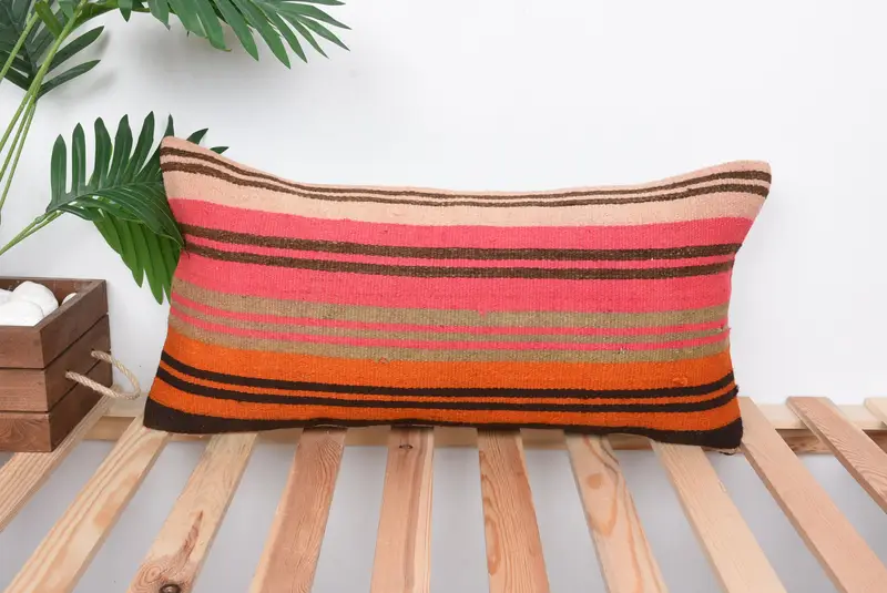 Handmade Embroidered Pink Throw Pillow, 12x24 Vintage Striped Cushion