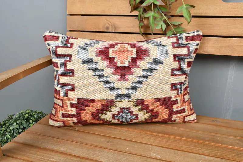 Geometric Beige & Red Embroidered Pillow, Handmade Vintage Throw Pillow