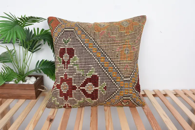 Orange & Red Embroidered Throw Pillow, Bohemian Geometric Pillow