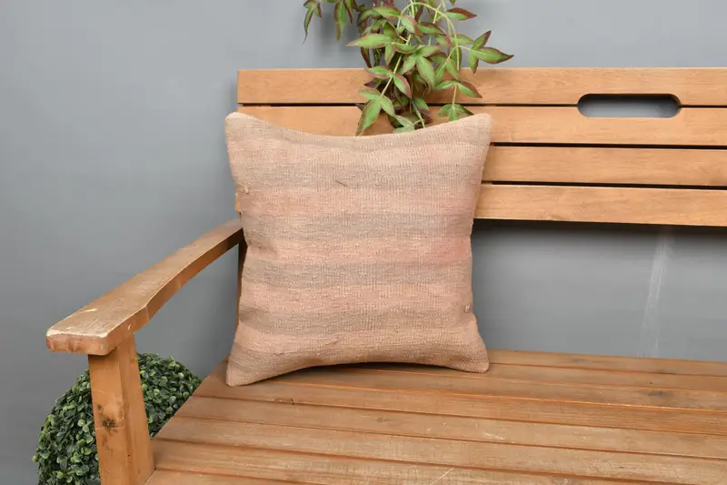Pink, Brown Striped Embroidered Pillow, 16x16 Handmade Throw Pillow
