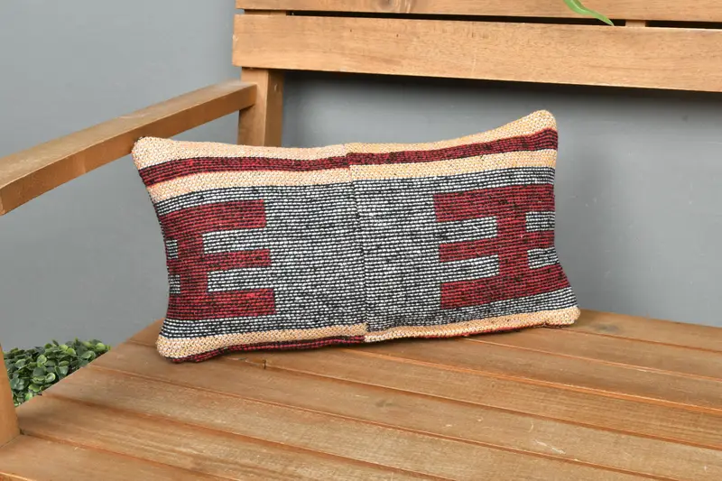 Red Linen Throw Pillow with Geometric Pattern, Vintage Embroidered Pillow