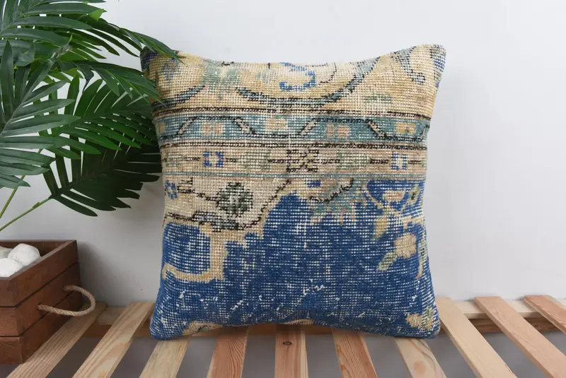 Blue Southwestern Throw Pillow, 18x18 Vintage Embroidered Cushion