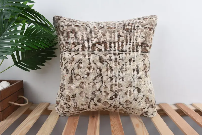 Handmade Embroidered Throw Pillow, Southwestern Beige & Brown Vintage Pillow