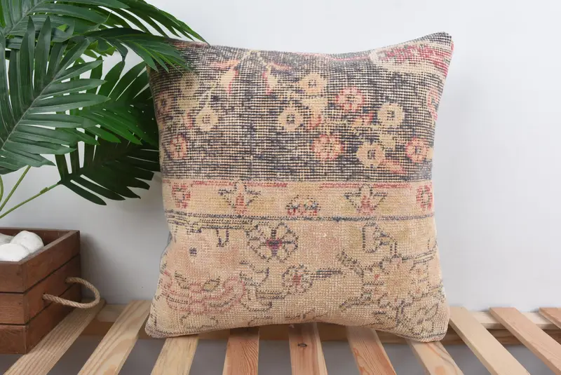 Beige & Bronze Floral Embroidered Throw Pillow, Vintage Cushion